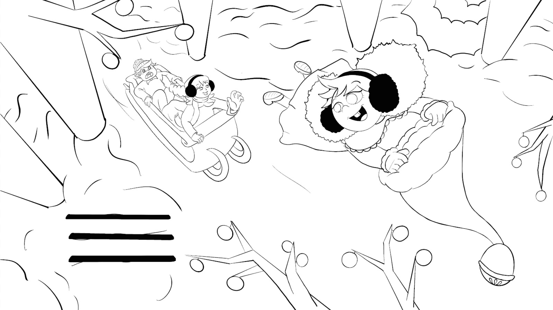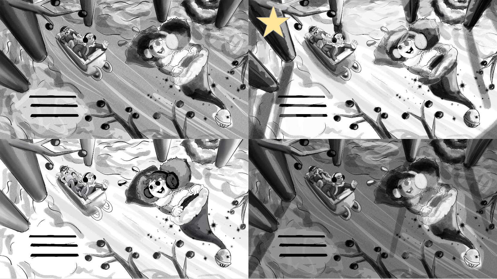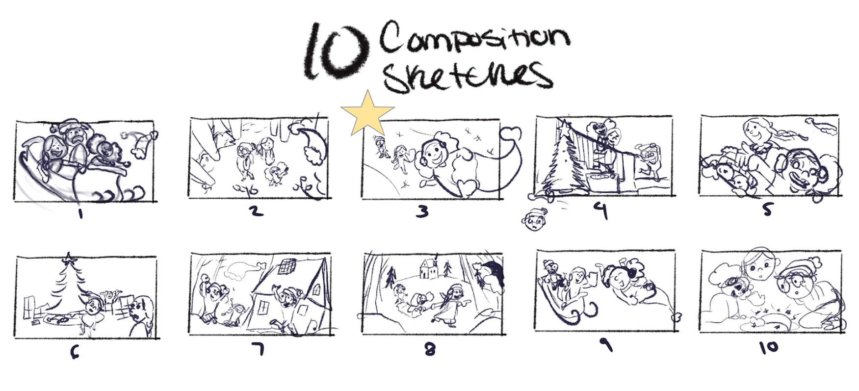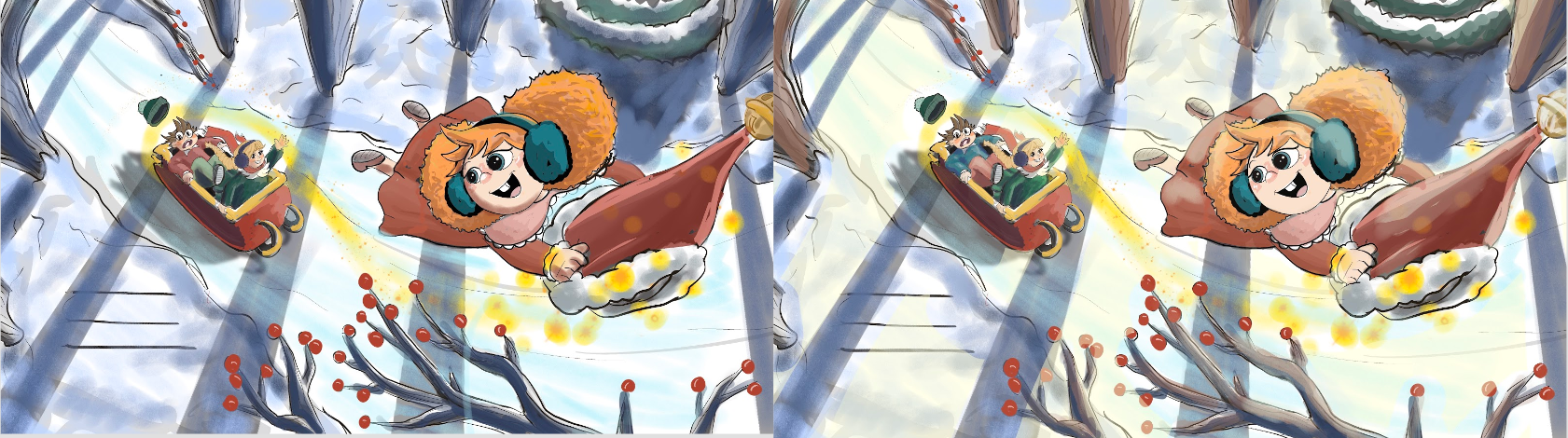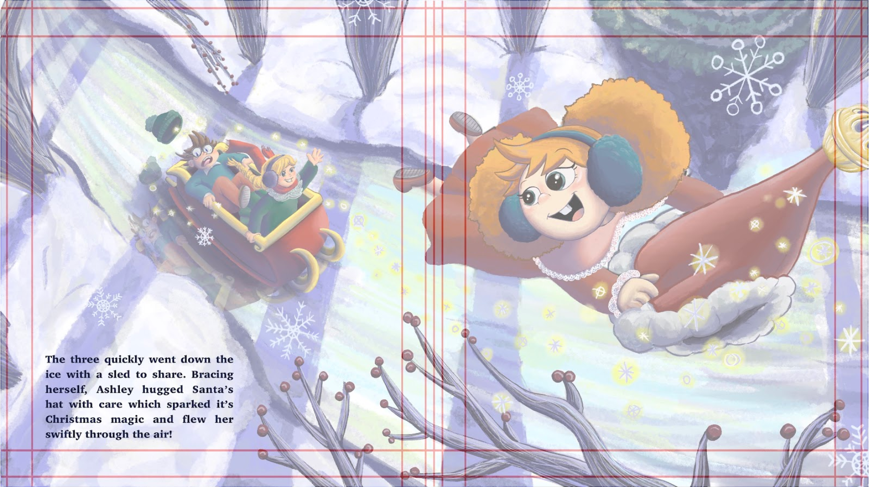 My vision for this Christmas Children's Book spread was something that was whimsical, energetic and filled with magic. Naturally when thinking about Christmas one thinks of their loved ones. My 2 younger siblings were a lot of my inspiration for this story and in general. Commonly you will see 3 children a lot of times in my illustrations due to their influence on me as an older sister. I wanted to document their personalities in this spread and included their own names within the text. Overall, this is my favorite by far spread I've made not only due to the connection I made with it but also the connection it gives to others as well.